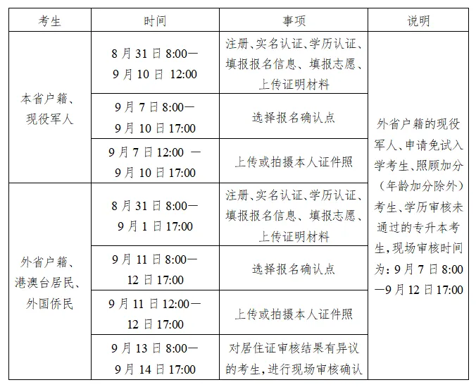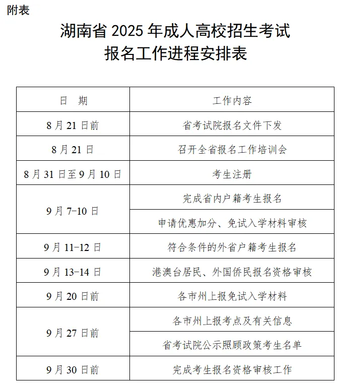 2025年成人高校招生全国统一考试定于10月18日、19日举行。近日,省教育考试院发布《湖南省2025年成人高校招生考试报名工作实施办法》,根据工作安排,8月31日起,考生可进行注册及认证。本省户籍、现役军人考生可于9月7日8:00至9月10日17:00选择报名确认点;外省户籍、港澳台居民、外国侨民考生可于9月11日8:00至9月12日17:00选择报名确认点。