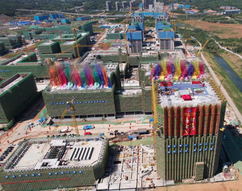 同样完成了主体结构封顶的,还有湖南大学科创港校区二标段项目。该项目建设内容包括新材料产教融合创新平台、功能核酸基础科学研究中心、高端装备集群智能制造中心、数字传播与文化产业研究中心、人工智能与机器人技术创新中心、先进半导体技术与应用工程中心、生物与生命医学交叉科学创新平台等。截至目前,湖南大学科创港校区一期33栋单体建筑已有20栋完成主体结构封顶,各类配套设施建设也同步展开。计划于2026年9月投入运营,明年入学的新生有福啦!