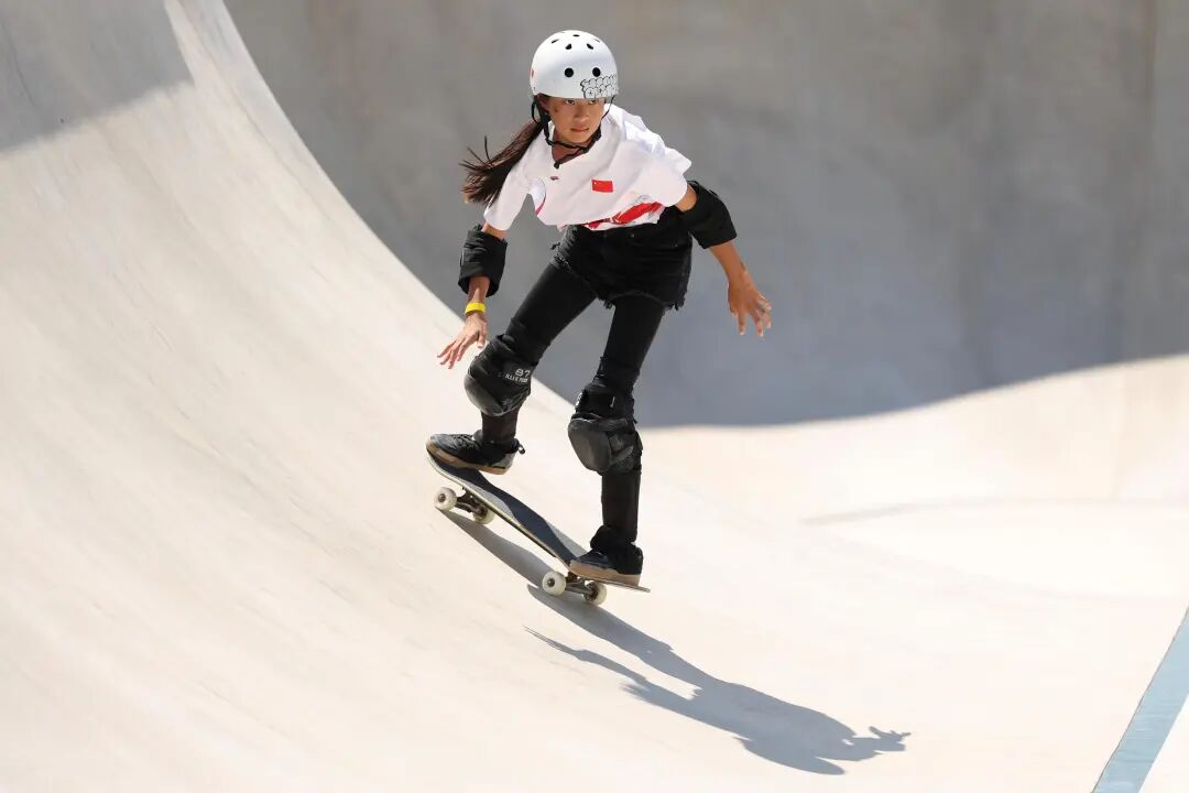 △2024年8月6日,巴黎奥运会滑板女子公园赛,郑好好完成奥运首秀