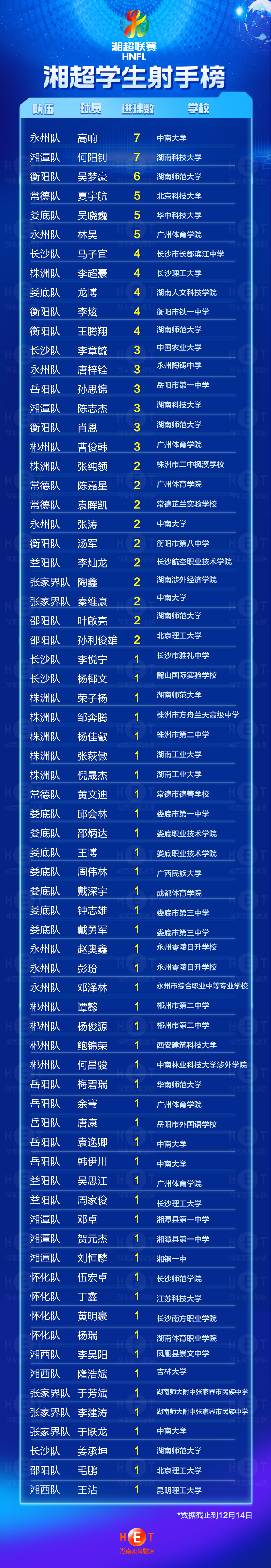 湘超学生榜射手榜最新出炉!(截止到12月14日)