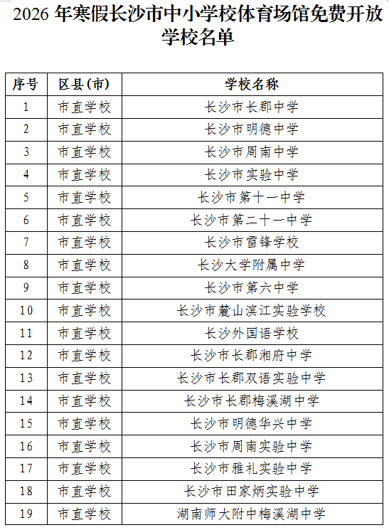 为推动全民健身运动,满足群众健身需求,缓解公共体育设施不足,2026年寒假期间,长沙市358所公办学校体育场地设施免费向社会公众开放。
