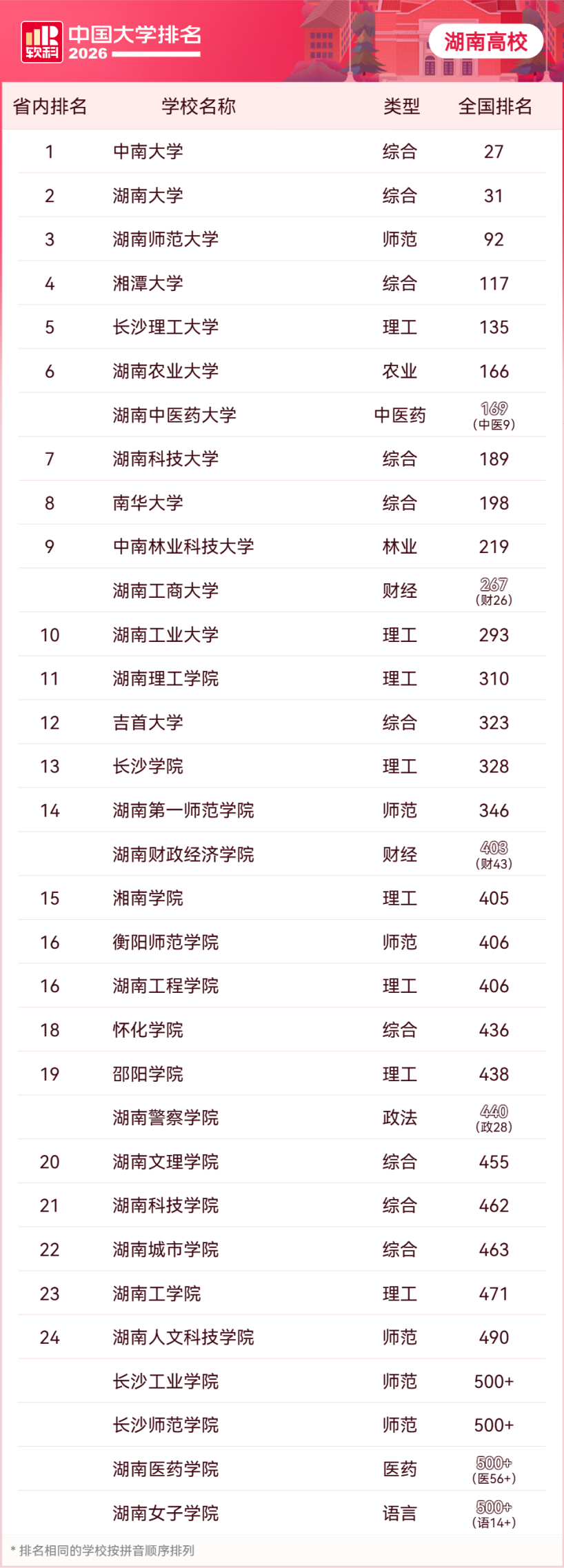 单科性大学排名中,湖南特色高校优势凸显:湖南中医药大学在中医药大学专项排名中位列第9名;湖南工商大学、湖南财政经济学院在财经类大学排名中分别位居第26名、第43名;湖南警察学院在政法类大学排名中位列第28名,为法治建设输送优质人才。