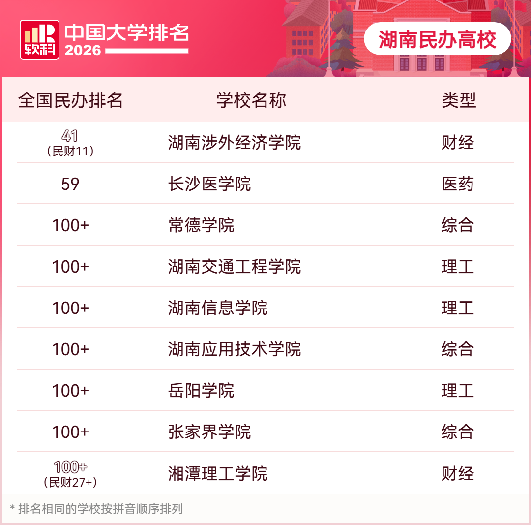 民办高校领域同样传来捷报:在民办主榜中,长沙医学院跻身民办高校100强,位列第59名;湖南涉外经济学院在民办财经类排名中位列第41名,较去年大幅提升8个位次,展现出民办高校强劲的发展势头。