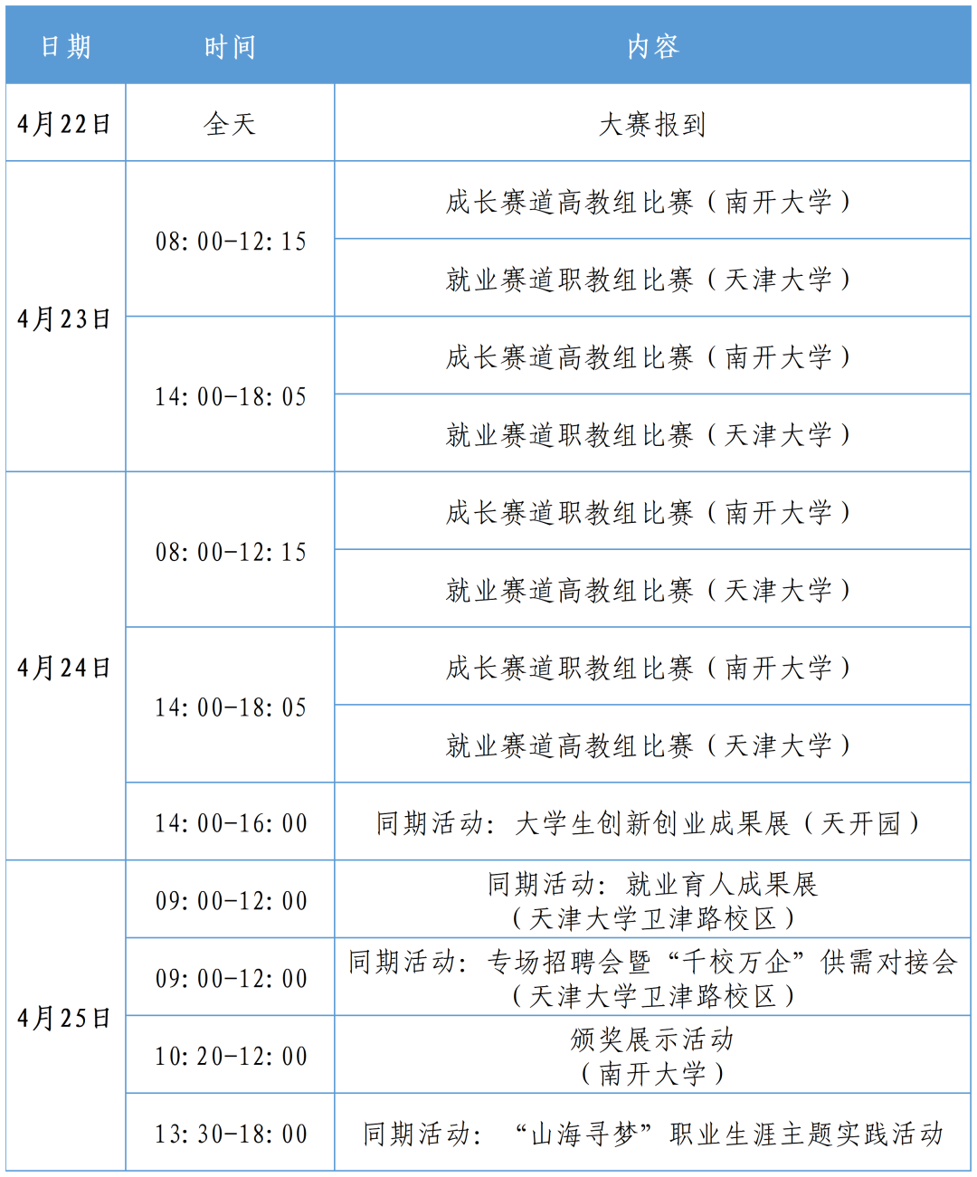 4月22日至25日,第三届全国大学生职业规划大赛全国总决赛将在天津举行。一起来看主体赛事及同期活动日程安排——