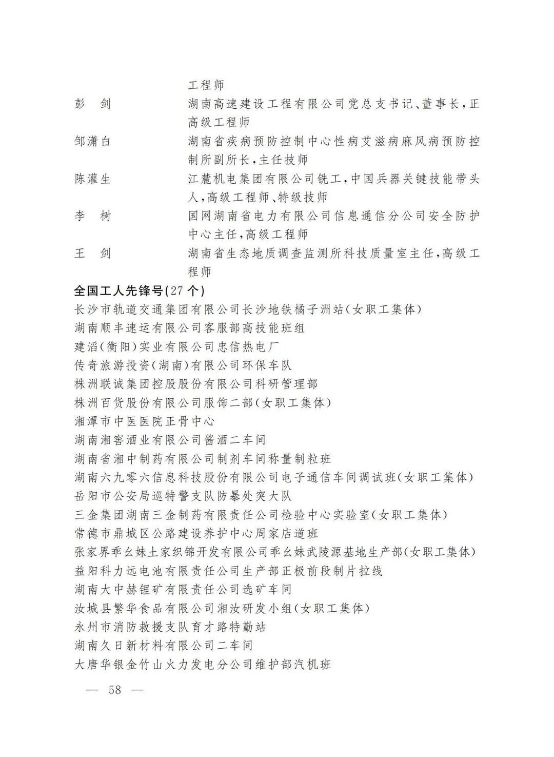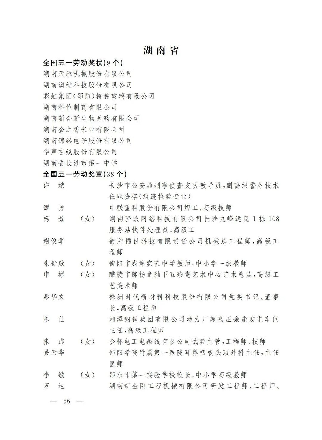 为表彰激励先进典型,凝聚起团结奋进的强大力量,中华全国总工会决定,授予北京北一机床有限责任公司等379个单位全国五一劳动奖状,授予吴勇等1462名职工全国五一劳动奖章,授予北京北斗星通导航技术股份有限公司地基云端算法团队等1183个集体全国工人先锋号,对受表彰的先进女职工个人和集体同时授予全国五一巾帼标兵和全国五一巾帼标兵岗。希望受到表彰的先进集体和个人,珍惜荣誉、保持本色,继续努力、再立新功。