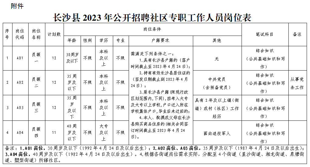 根据《关于印发<长沙县社区专职工作人员员额管理实施办法(试行)>的通知》(长县民发〔2020〕39号)文件精神,为增强长沙市长沙县社区工作力量,强化社区治理服务能力,经研究,决定面向社会公开招聘社区专职工作人员47名。