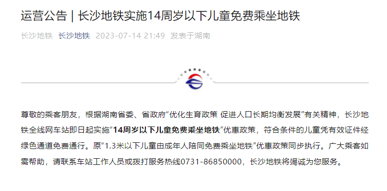 长沙地铁微信公号发布公告:尊敬的乘客朋友,根据湖南省委、省政府“优化生育政策 促进人口长期均衡发展”有关精神,长沙地铁全线网车站即日起实施“14周岁以下儿童免费乘坐地铁”优惠政策,符合条件的儿童凭有效证件经绿色通道免费通行。原“1.3米以下儿童由成年人陪同免费乘坐地铁”优惠政策同步执行。广大乘客如需帮助,请联系车站工作人员或拨打服务热线0731-86850000,长沙地铁将竭诚为您服务。