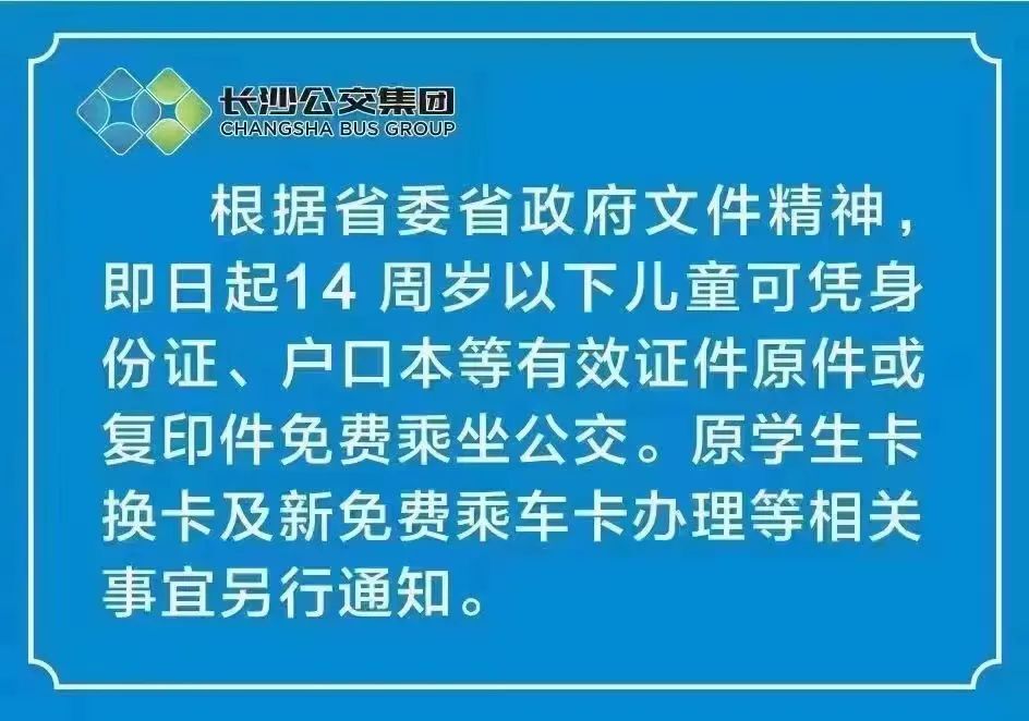 长沙公交集团发布公告:根据省委省政府文件精神,即日起14周岁以下儿童可凭身份证、户口本等有效证件原件或复印件免费乘坐公交。原学生卡换卡及新免费乘车卡办理等相关事宜另行通知。