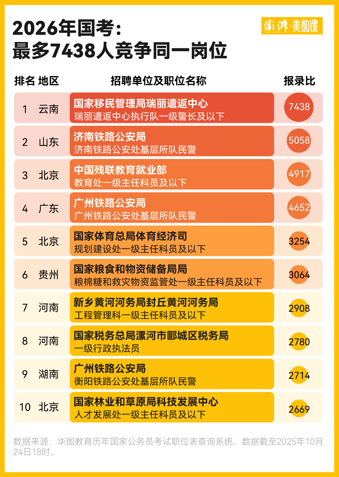 报录比最高、竞争最激烈的岗位是历年国考报名的关注焦点。数据显示,2026年国考竞争最激烈岗位是“瑞丽遣返中心执行队一级警长及以下”,报录比为7438:1。其他上榜今年十大热门岗位的还有来自公安局、残联、体育局、税务局等部门的岗位。