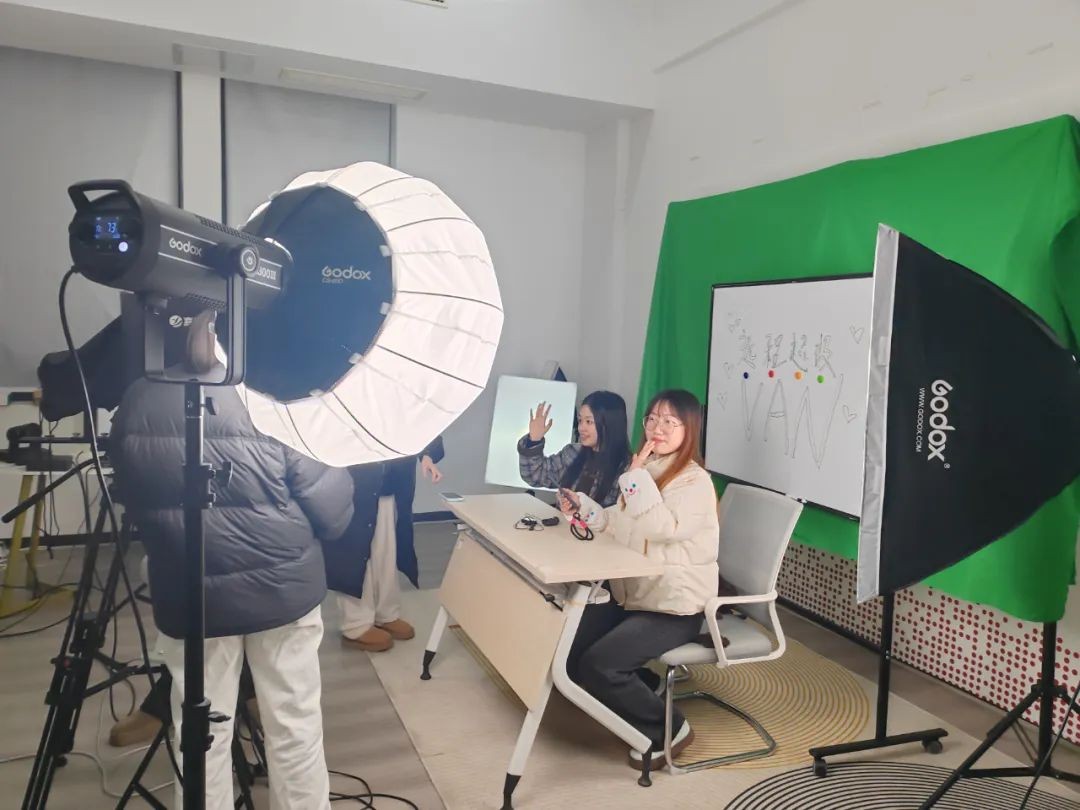 “基于我们现在有的设备,你们觉得光应该怎么布呢?”在介绍完相关知识和设备后,罗天婵一步步引导同学在校内直播间亲身体验直播。一开始,同学们还有些拘谨,但随着实践深入,大家逐渐放开手脚,开始自主探索。有人负责布光,有人负责搭景,还有人研究提词器和麦克风,整个过程充满互动性和参与感。
