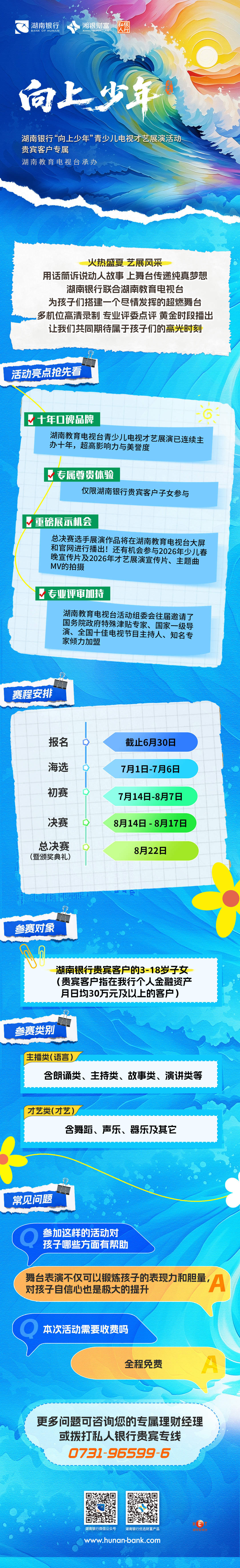 由湖南银行主办,湖南教育电视台承办的2025年湖南银行“向上少年”青少儿电视才艺展演活动正式开启啦!快来看看怎样参与吧!