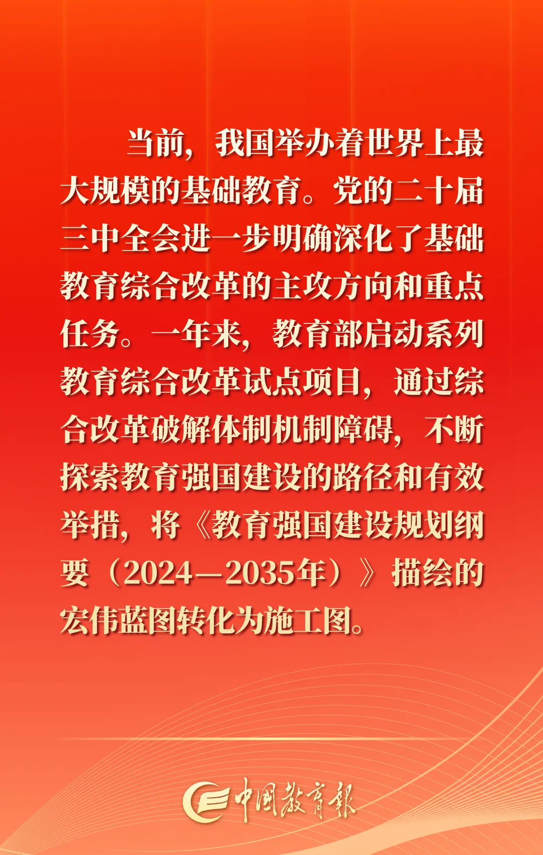 当前,我国举办着世界上最大规模的基础教育。党的二十届三中全会进一步明确深化了基础教育综合改革的主攻方向和重点任务。一年来,教育部启动系列教育综合改革试点项目,通过综合改革破解体制机制障碍,不断探索教育强国建设的路径和有效举措,将《教育强国建设规划纲要(2024—2035年)》描绘的宏伟蓝图转化为施工图。
