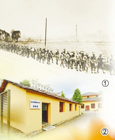 图①:长沙临时大学部分师生步行前往昆明图②:云南师范大学内的西南联大原教室
