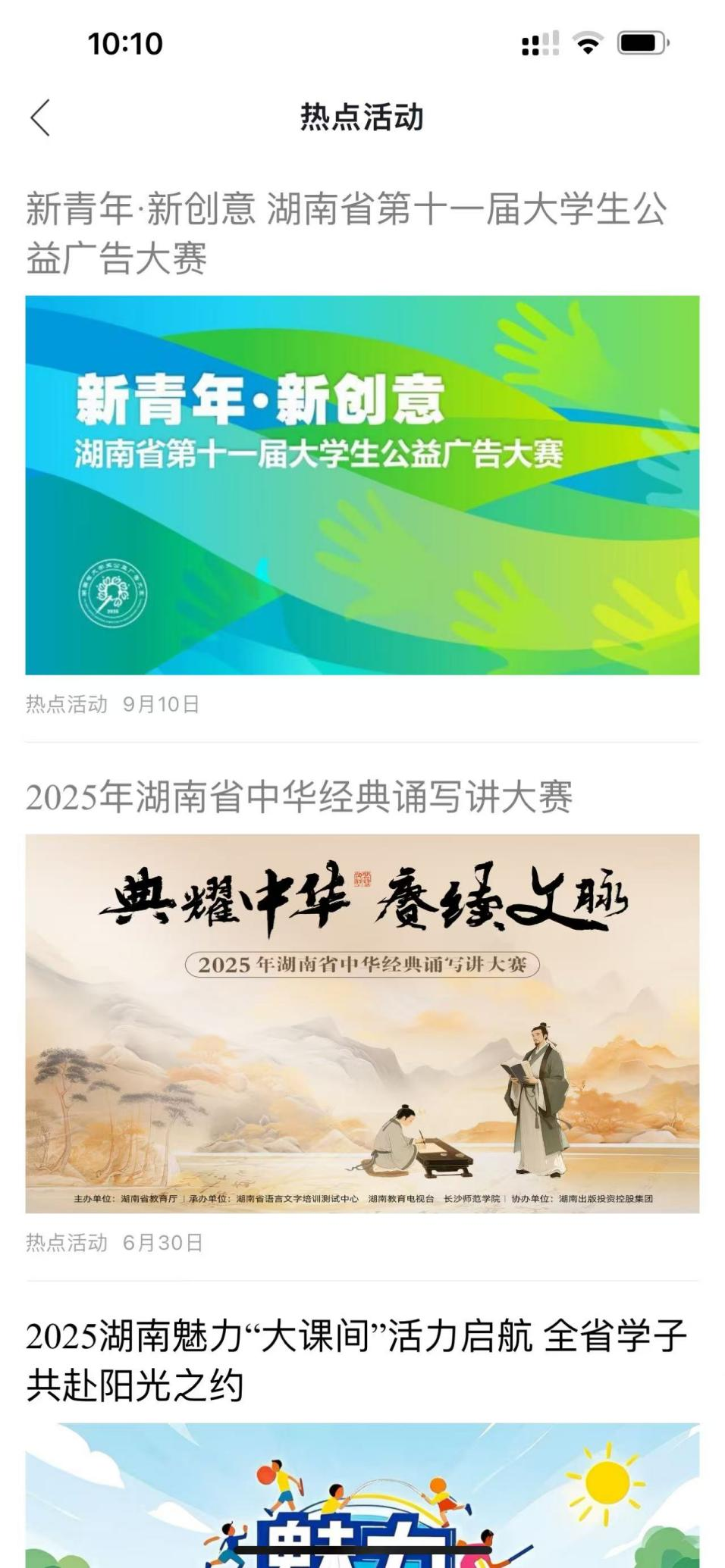登录/注册完成后,需要参赛报名的选手,通过点击页面左下角底部栏【推荐】按钮进入App首页,再点击进入【热点活动】板块,即可看到“新青年·新创意 湖南省第十一届大学生公益广告大赛”专栏页面。(图5、图6)