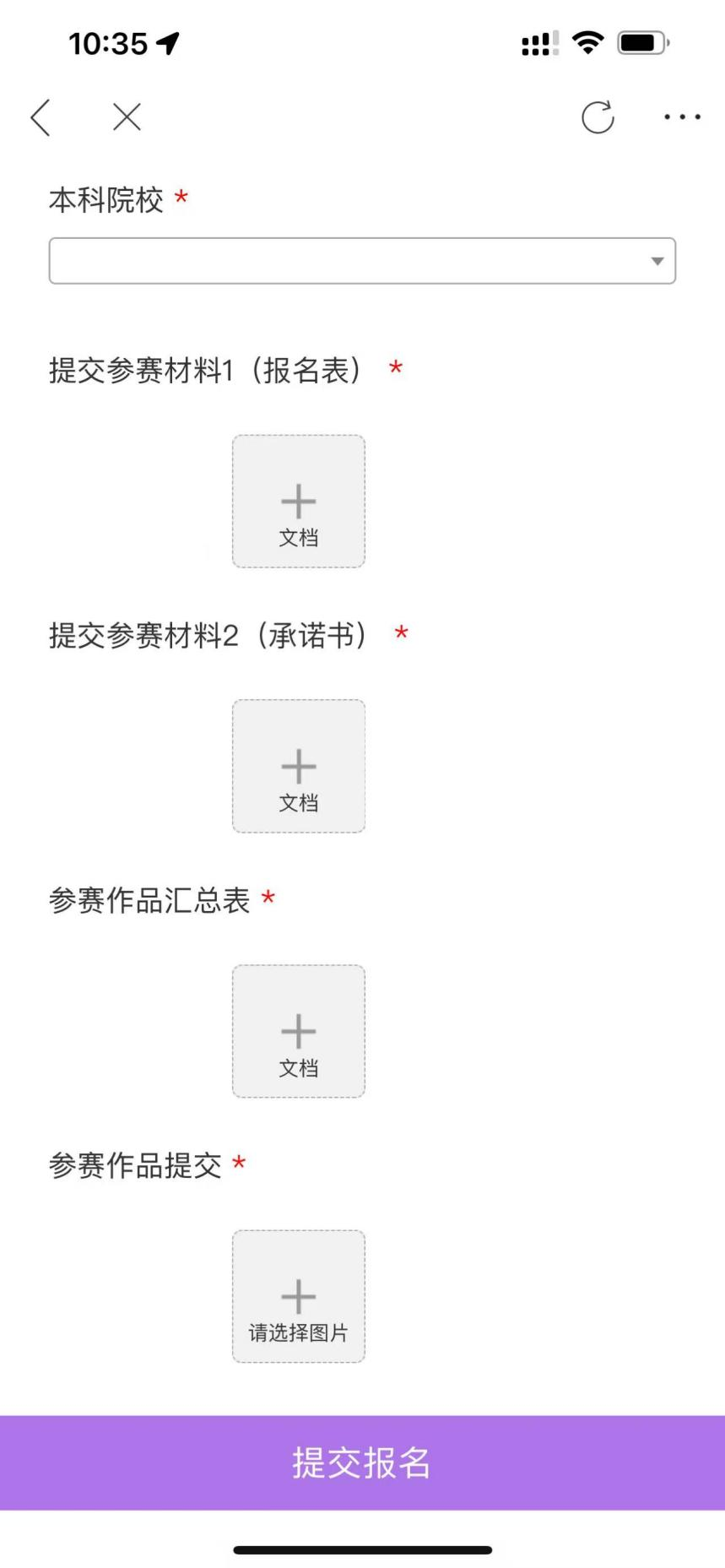 第三步:进入【我要报名】填报页面后,参赛选手按照2025年文件参赛要求,准确填写对应的报名信息。全部填写完成且核对信息无误后,在填报页面底部“参赛作品”一栏点击“+”上传参赛内容。而后,点击【提交报名】即完成参赛报名与作品上传全部流程。(图11、图12、图13)