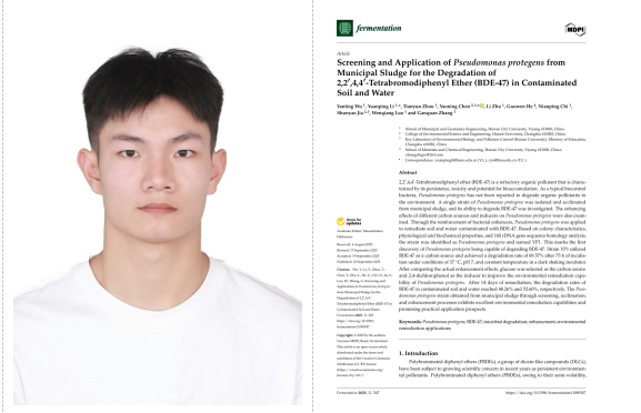 今年9月,给排水科学与工程专业大三学生吴彦廷以第一作者身份,在SCI期刊《Fermentation》上发表了题为《Screening and Application of Pseudomonas protegens from Municipal Sludge for the Degradation of 2,2′,4,4′-Tetrabromodiphenyl Ether (BDE-47) in Contaminated Soil and Water》的学术论文。该研究创新性地利用市政污泥,成功筛选并驯化出一株能高效降解典型新污染物四溴联苯醚(BDE-47)的防御假单胞菌,为有机污染场地绿色修复提供了全新的技术路径。