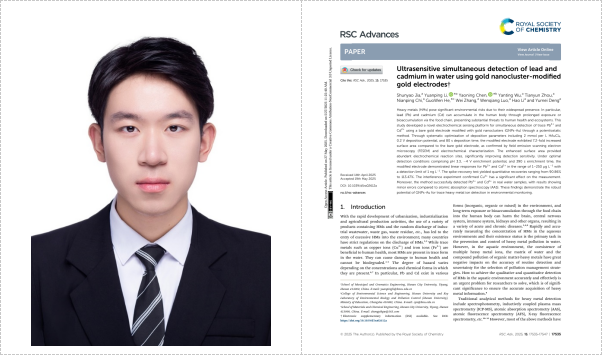 今年3月,同专业毕业生贾舜尧也以第一作者身份在另一SCI期刊《RSC Advances》发表学术论文《Ultrasensitive simultaneous detection of lead and cadmium in water using gold nanocluster-modified gold electrodes》。他成功构建了一种新的电化学传感检测平台,实现了对水中痕量重金属离子的超灵敏同步检测,为复杂环境中重金属污染在线监测提供了创新性解决方案。
