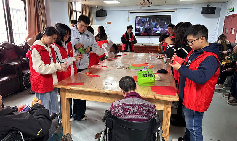 随后,志愿者们与老人们围坐一堂,手把手地教他们折叠象征平安与祝福的千纸鹤。面对手部灵活性不足的老人,志愿者们便轻柔地握住他们的手,一步步耐心引导,共同完成作品。志愿者们还将折好的千纸鹤作为礼物赠送给老人,并将写有“愿您岁岁常安康”、“福寿绵长”等真挚祝福的卡片细心塞入纸鹤翅膀,寄托着对老人们健康长寿、生活顺遂的美好祝愿。
