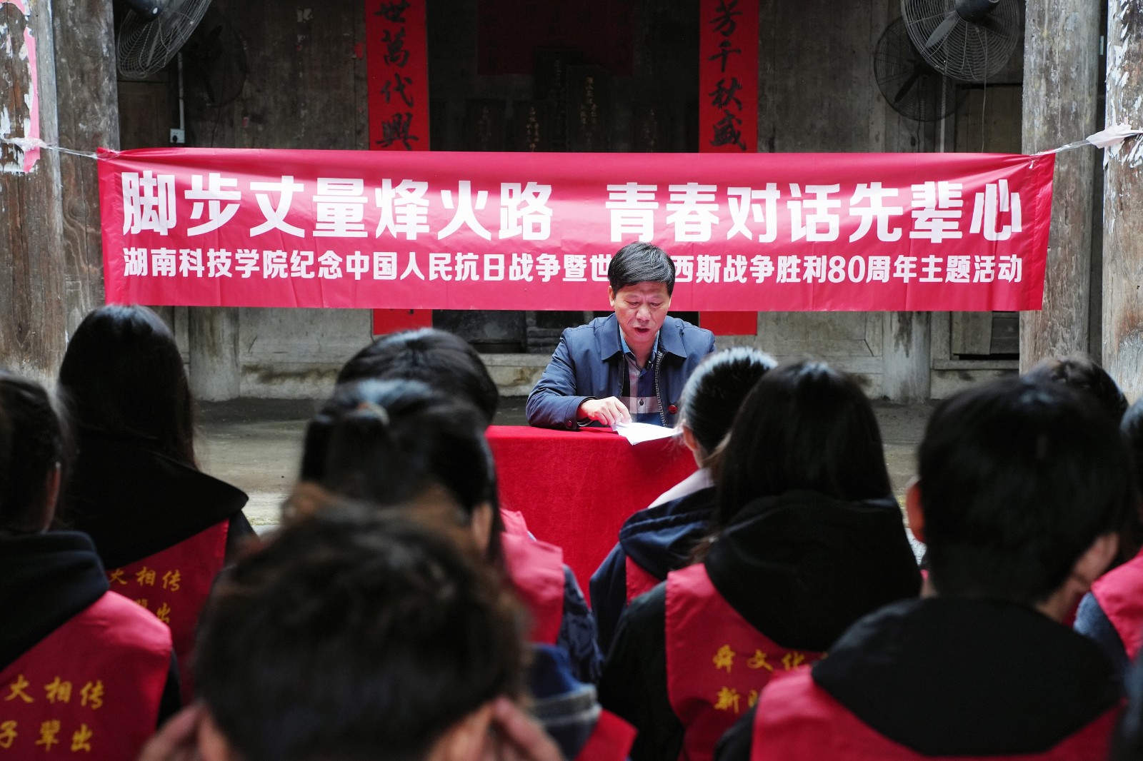 “我们学校四迁其址,七易其冠,1944年因日寇铁骑肆虐,为保存教育薪火,从道县迁至此地,不仅坚持正常教学,还积极开展抗日宣传,组织学生参与地方建设。”该校二级教授潘剑锋以学校旧址麦地村黄家宗祠为讲堂,向师生讲述了先辈们如何在战火中坚守教育事业的往事,介绍了从“湖南省立第七师范学校”到“湖南科技学院”的筚路蓝缕。
