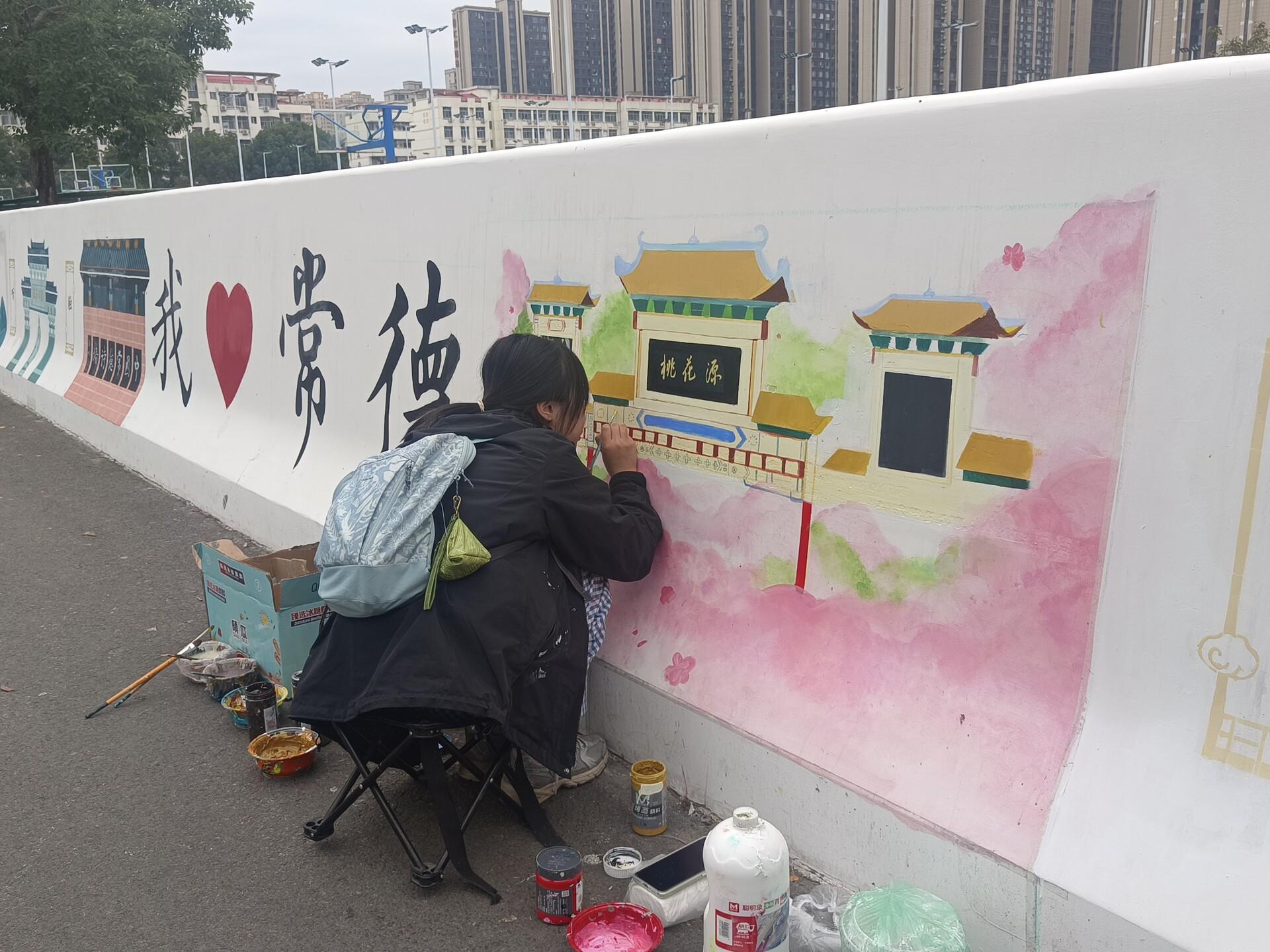 在此次桥体美化中,学生们充分发挥专业特长,将太阳山、桃花源、中国常德诗墙等常德地标景观与学校图书馆、船型楼等校园建筑巧妙融合,通过“我爱常德”“我爱文理”等主题文字,构建起连接学子与母校、学子与城市的情感纽带。