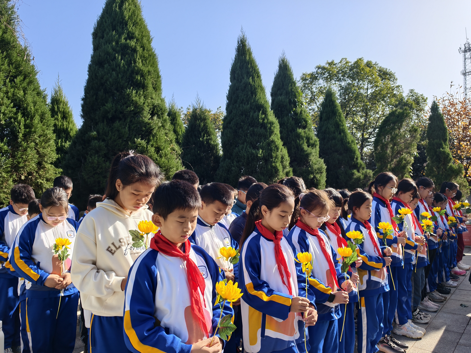 昔日烽火地,今朝少年行。在庄严肃穆的纪念园内,师生们举行了简朴而隆重的缅怀仪式。同学们身着整齐校服,手持菊花,列队肃立于纪念碑前。当讲解员深情讲述74军将士以血肉之躯阻击日军的惨烈战事,提及李翰卿将军殉国、173团浴血坚守等细节时,不少同学眼眶湿润。他们依次上前,敬献鲜花,指尖轻抚斑驳的碑文,将“铭记历史、珍爱和平”的信念深深植入心底。