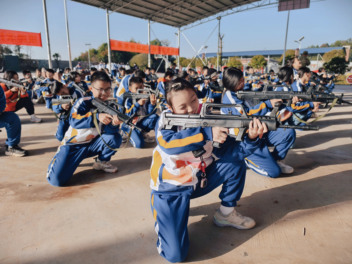 在队列训练中,同学们身姿挺拔,步伐铿锵,感受着军人的纪律与担当;在内务整理课上,反复练习叠“豆腐块”军被,磨炼着严谨细致的作风。榴弹炮发射模拟、高精度射击体验等环节,则让大家直观感受到科技强军的力量。在匍匐穿越、军火镭战等团队拓展活动中,同学们分工协作,并肩“作战”,在实践中体悟着先烈们团结拼搏的精神内核。
