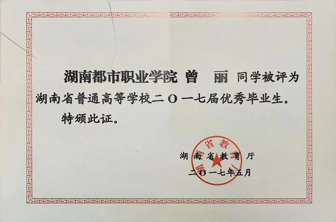 在湖南都市职业学院的这三年,曾丽凭借着全面出色的表现,在毕业时荣获了省级优秀毕业生的荣誉。这一荣誉,是对她大学时光中努力拼搏、积极进取精神的崇高赞誉,更是她青春岁月里闪耀夺目的勋章。