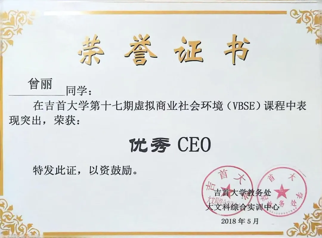 本科期间,曾丽始终保持着那份勤奋刻苦的学习劲头,如饥似渴地汲取知识的养分。她以严谨的态度对待每一门课程,踊跃参与课堂讨论,积极投身实践活动,在知识的海洋中不断锤炼自己的专业素养与实践能力。除了学习,曾丽还积极参加各种竞赛,在吉首大学开展的第十七期虚拟商业社会环境VBSE课程中,她凭借着扎实的专业知识和出色的领导能力,带领团队取得了优异的成绩,并荣获了优秀CEO的称号。这个荣誉不仅是对她个人能力的肯定,也为她所在的团队赢得了荣誉。