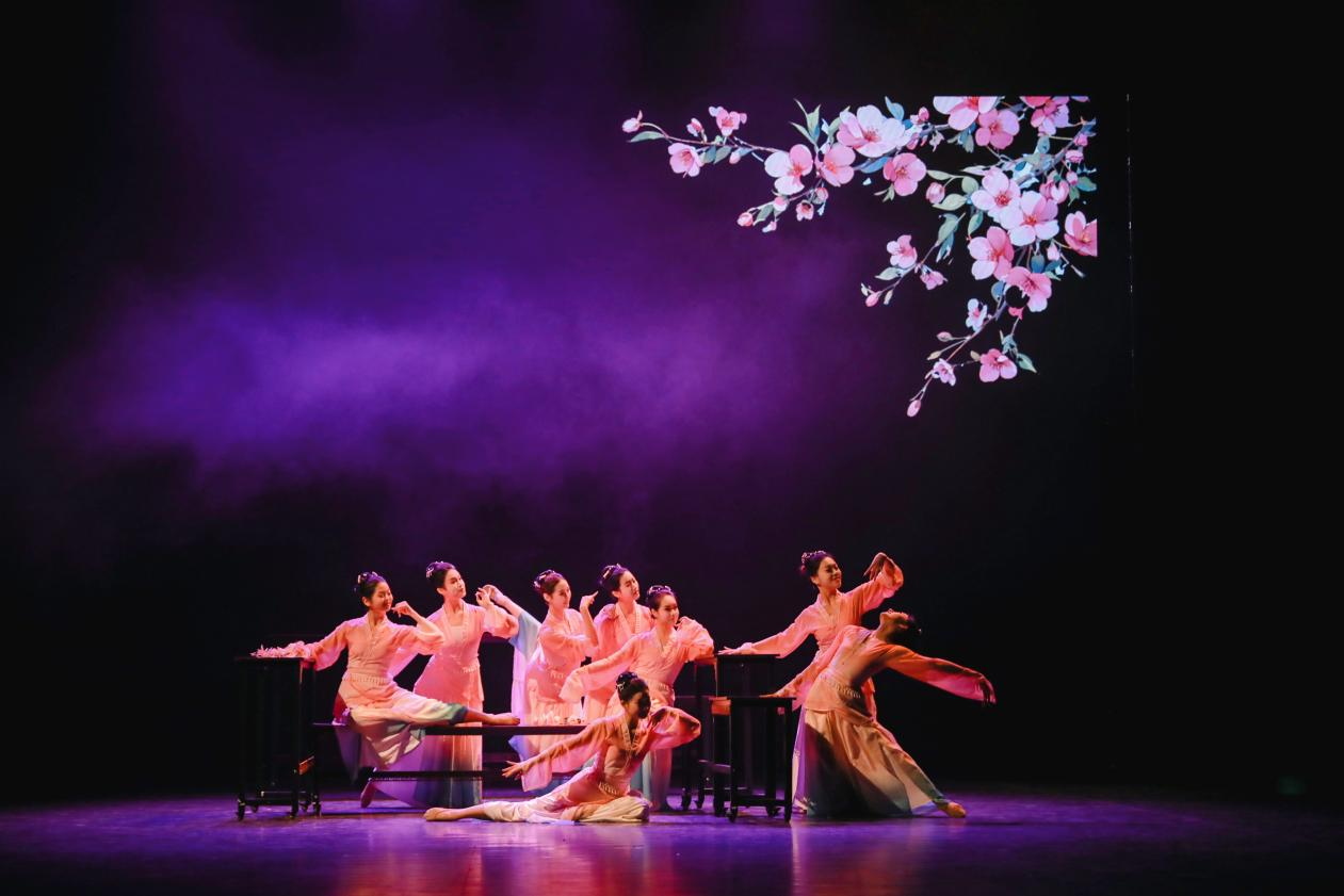 第二篇章集中展现育人成果的丰硕与鲜活。校工会校友合唱团演唱的《我的深情为你守候》,悠扬旋律中满含校友对母校的眷恋与感恩,见证学校育人初心的代代传承;体育部呈现的《活力青春》由校友与学生同台演绎,动感啦啦操展现了女院学子昂扬向上的精神风貌,彰显素质教育的扎实成效;音乐与舞蹈学院师生共同演绎的琵琶重奏《古城弦韵》,指尖流转间彰显中华优秀传统文化的独特魅力,体现了学校"五育并举"的育人理念。