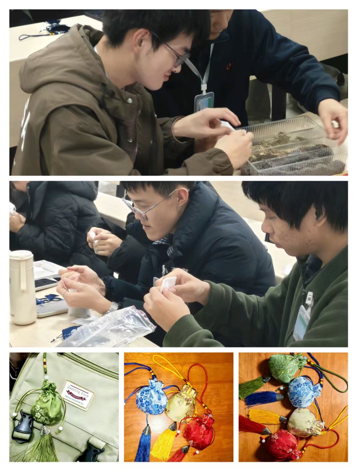 核心创作环节以成语接龙小游戏确定挑选香囊袋的顺序。同学们有序选取后,工作人员发放香料包。在主持人的现场演示下,大家清晰掌握了制作步骤,随后投入沉浸式创作。同时,主持人分发小纸条,同学们写下新年愿望放入香囊。约30分钟后,一个个如同“时光胶囊”的专属香囊陆续完成。