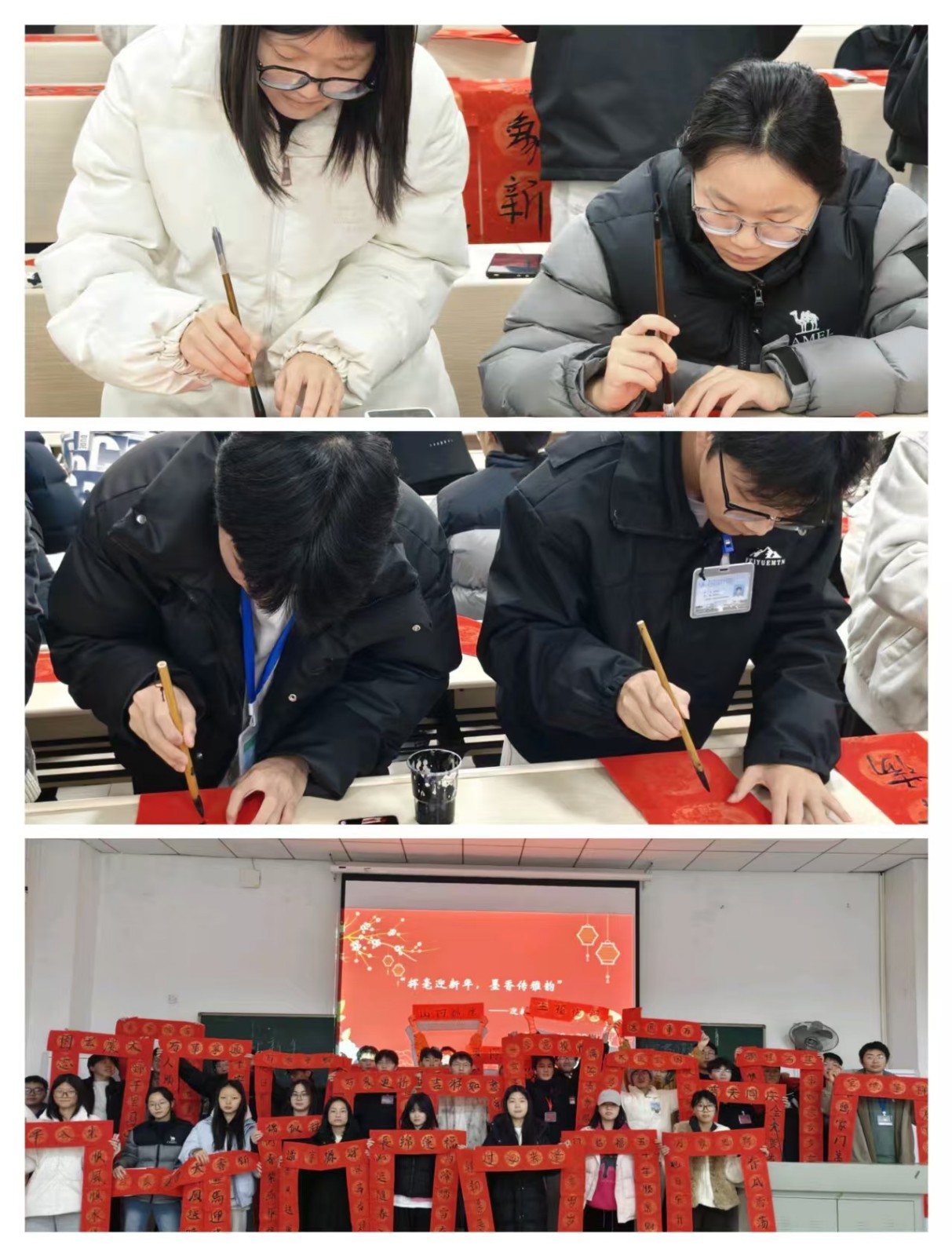 在“挥毫迎新年,墨香传雅韵”主题活动中,主持人首先讲解了元旦的起源、民俗以及春联文化,包括平仄对仗规则与创作技巧,为同学们打下创作基础。随后进入高潮迭起的创作环节:笔墨纸砚齐备,红纸铺展。同学们或临摹经典春联,或结合航空专业特色进行原创,如“逐梦蓝天承壮志,挥毫沃野启新程”等作品既彰显文化底蕴,又富有专业特色。笔墨之间寄托着对新年的期盼,现场墨香弥漫、喜庆洋溢。活动尾声的“方言传话筒”游戏更是点燃全场热情。同学们分组接力传话,各地方言的独特腔调让传递过程妙趣横生,大家在欢笑中拉近距离、增进情谊。