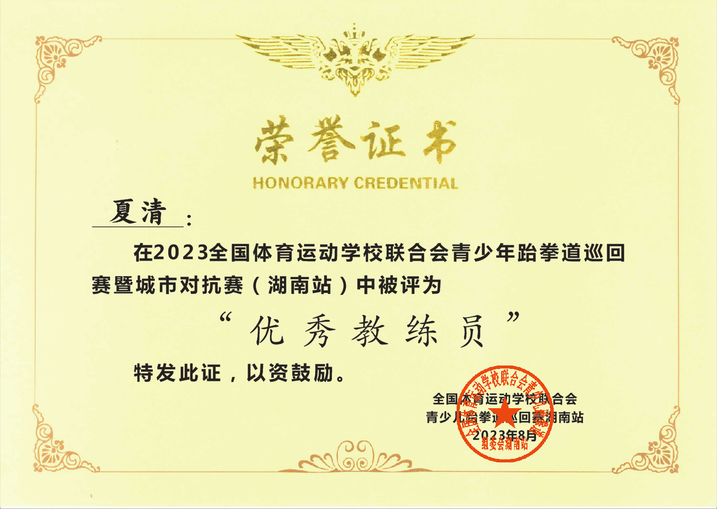 这份坚守终获硕果:“湘英会” 跆拳道馆从狭小阁楼迁至近 300 平方米的专业武道馆,配齐标准化训练设施与安全防护装备,到现在为止创建的跆拳道基地校总共有13所,累计覆盖训练队员8000人以上,目前在训学员1280人。他带领学员征战省、市及全国性跆拳道赛事,2023 年,他在全国体育运动学校联合会青少年跆拳道巡回赛暨城市对抗赛(湖南站)中获评 “优秀教练员”,其创办的武道馆也被长沙市体育局、长沙市教育局联合认定为 “长沙县跆拳道后备人才基地”,连续两年获评 “湖南省青少年体育培训示范机构”。