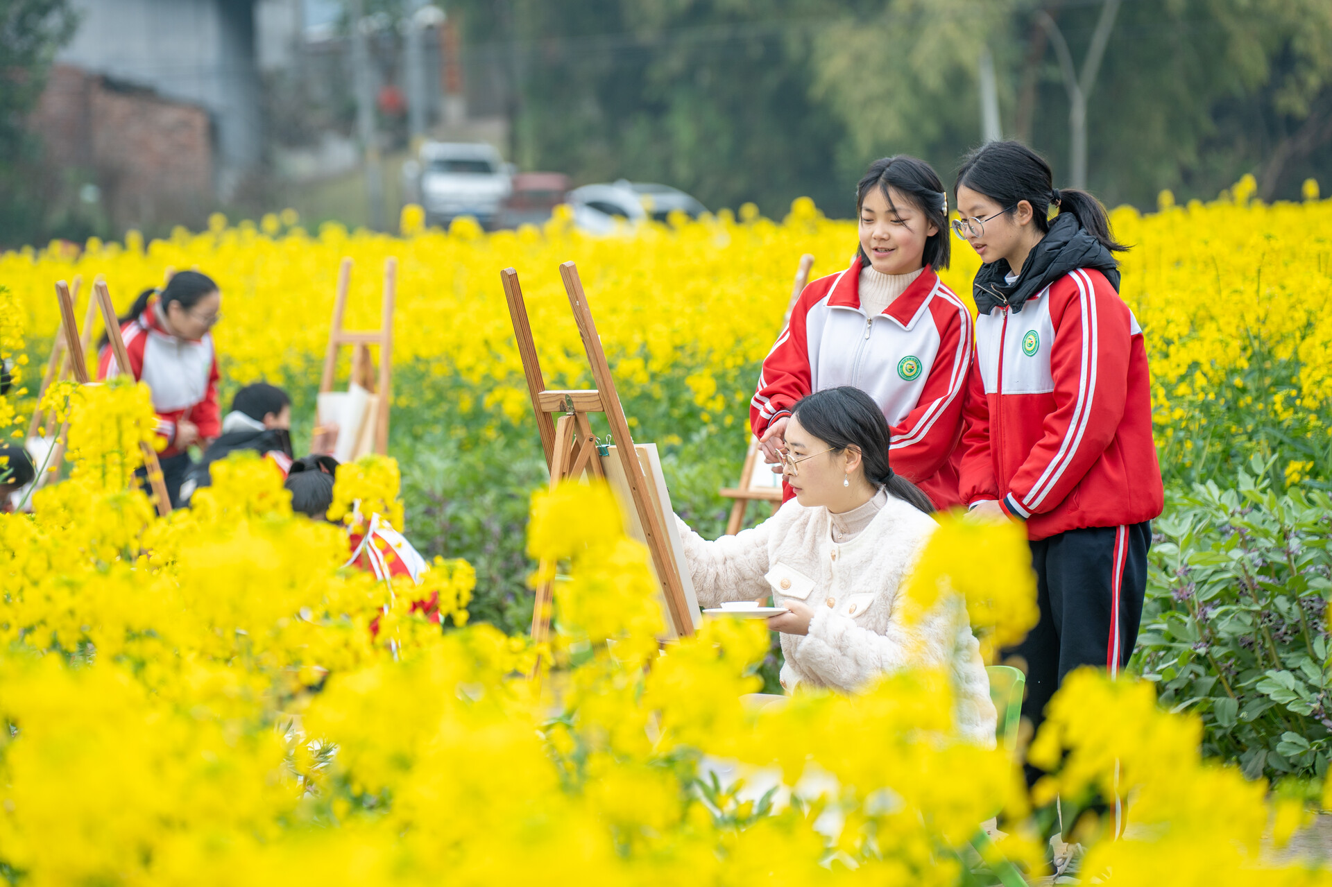 图为四川省眉山天府新区观寺学校师生到贵平镇油菜基地进行田间写生