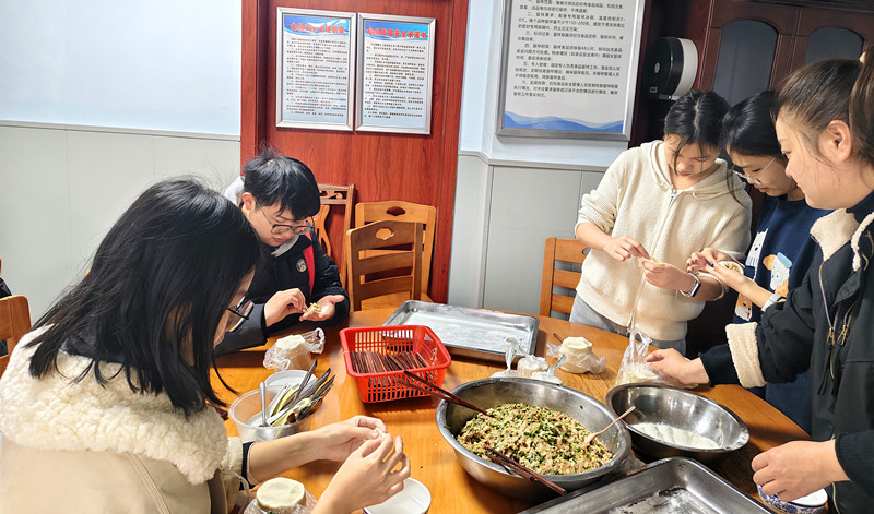 包饺子环节,志愿者们默契配合,揉面、擀皮、调馅、包制,动作娴熟、一气呵成,现场气氛热烈而有序。部分身体硬朗的长者被同学们的热情感染,主动加入包饺子的队伍,手把手地向同学们传授捏褶的技巧。老少同堂,其乐融融,欢声笑语间,浓浓的烟火气与温情交织在一起。