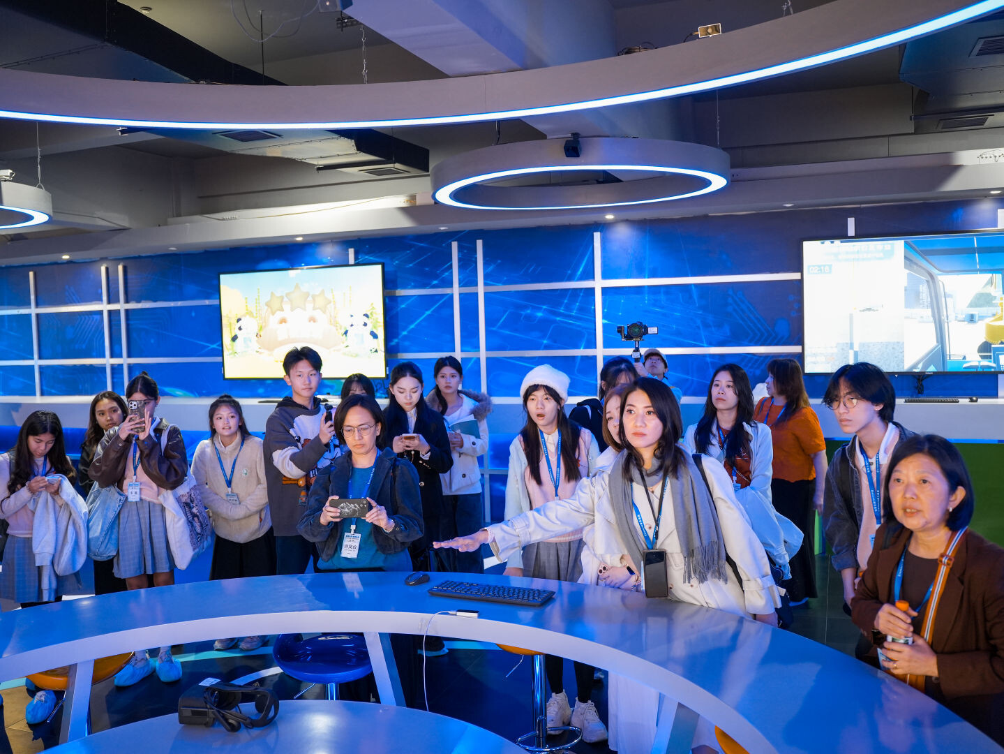 开班仪式结束后,研修班一行参观了该校全媒体实训室、新媒体技术学院、影视艺术学院,实地体验了虚拟演播系统、全息投影等教学实践设备,观摩了AIGC内容生成、智能剪辑辅助、虚拟数字人制作等AI技术在教学中的实践成果。