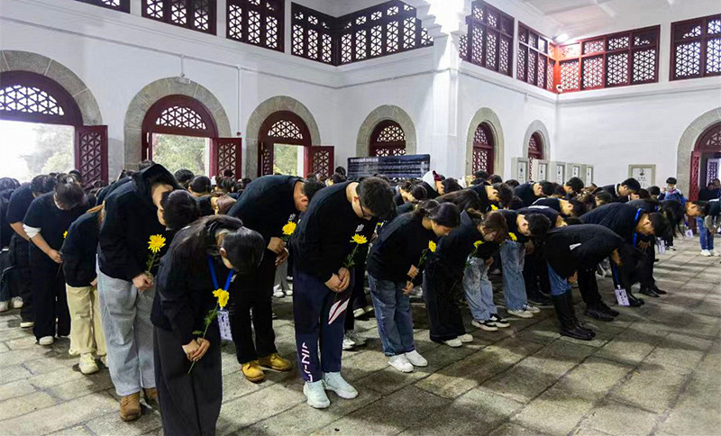 仪式现场,全体师生神情肃穆,依次整理挽联、追思英烈事迹。大家手持素菊,依次敬献于忠烈灵前,并深深三鞠躬。每一个动作都庄重而虔诚,每一个眼神都饱含敬意,以此表达对先烈们的深切追思与崇高礼赞。
