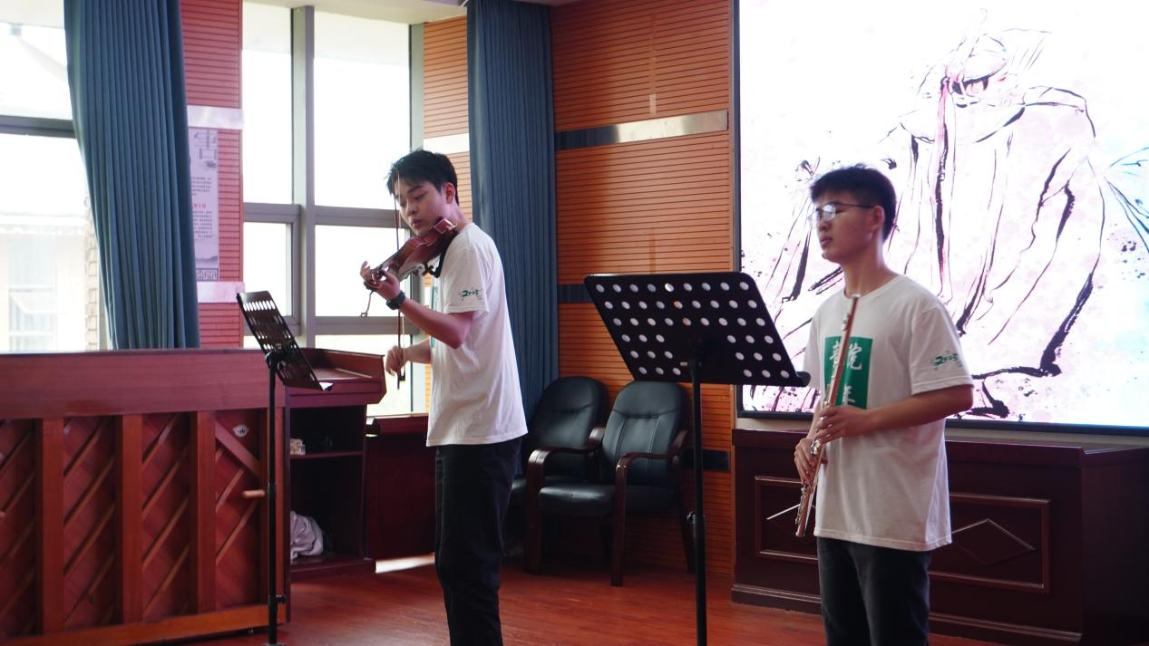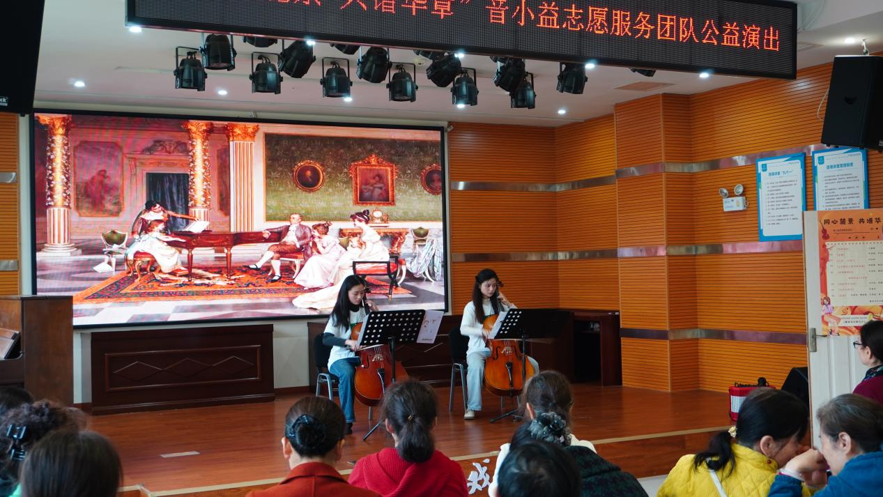 音小益团队的志愿者们发挥专业优势,为长辈们精心准备了风格多元的艺术节目。王鑫博老师的民族舞蹈《牧野清歌》以经典的柔臂与马步,生动勾勒出草原的辽阔,带长辈们领略牧歌悠扬的诗意;许茂森和李昱达老师的小提琴与长笛二重奏《化蝶》将东方凄美的爱情传说以西洋乐器细腻演绎,引起现场阵阵掌声;刘雨嫣和费亦涵老师的维瓦尔第的《g小调双大提琴协奏曲》则以饱满的情绪和张力,展现了巴洛克音乐的华丽与庄重;而许安珍老师的古筝独奏《行者》更是通过指尖流转,带领观众在古韵中追寻大漠孤烟的文化情怀。