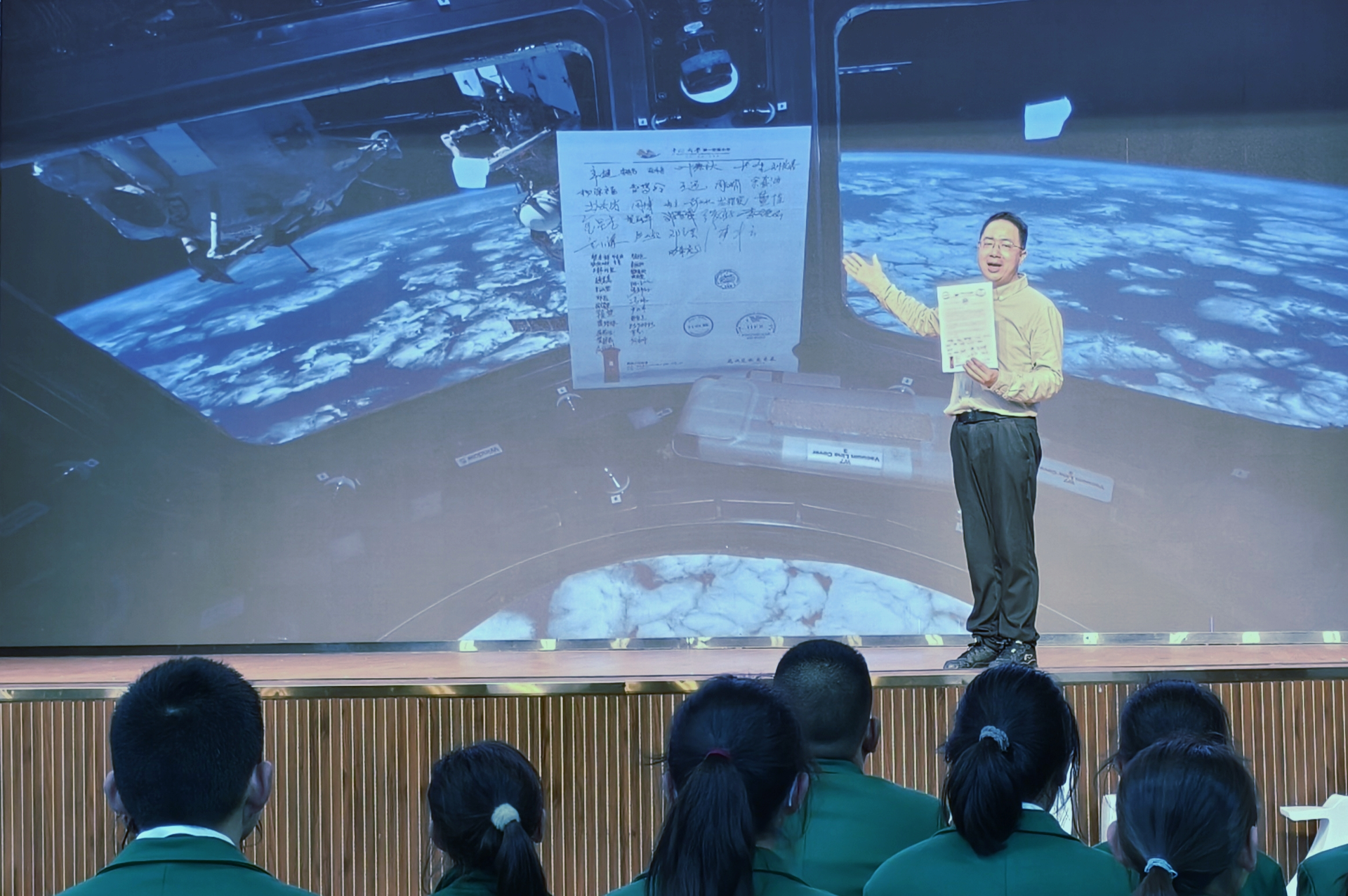 开箱仪式上,麓枫少年邮局指导老师陈中云主持发布并全程解说,结合邮件实物、8K在轨影像资料及三枚太空专属邮戳,为同学们生动复盘了从火箭发射、太空驻留到返航着陆的完整历程。当密封包装缓缓打开,印有太空邮戳与多国航天员签名的信件完整呈现在眼前时,现场响起阵阵惊叹与掌声。同学们近距离观看信件上的三重太空纪念戳,真切感受到这场天地之旅的非凡意义。