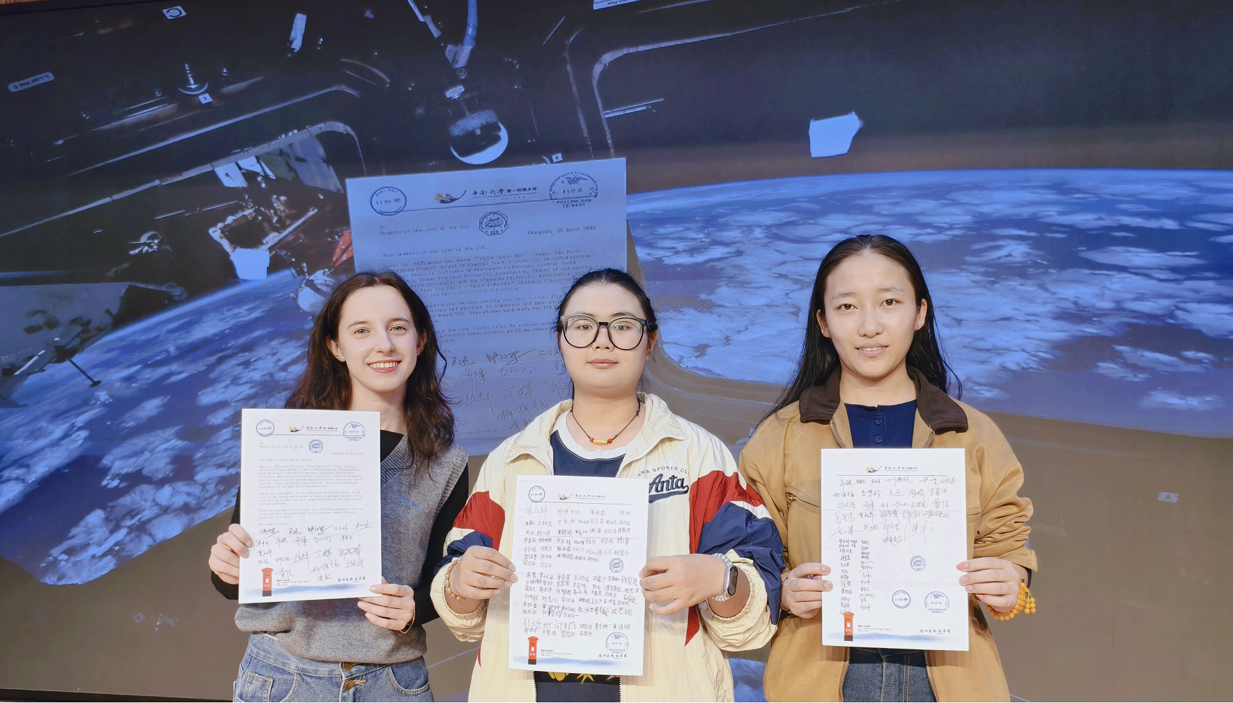 本次活动现场特邀中南大学保加利亚籍留学生温拉(Vera),以及资源与安全工程学院、马克思主义学院藏族大学生尼珍、仁增卓玛共同参与。活动中,温拉为同学们讲解世界航天日的历史渊源,展示联合国及多国发行的航天主题邮票,以国际化视角阐释了“太空邮件”作为文明交流互鉴载体的独特价值;藏族学子同步将活动实况分享至高原家乡,搭建起与民族地区学校的沟通桥梁,让优质教育资源跨越山海、共享共育。